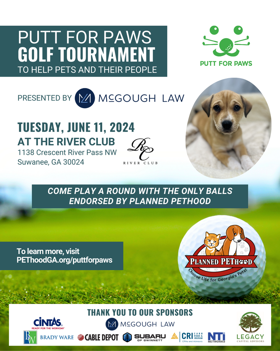 Join Planned PEThood of Georgia for Putt for Paws Golf Tournament at River Club on Tuesday, June 11, 2024! This event will benefit pets and the people who love them throughout Georgia.